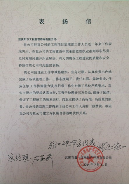 我公司駐龍江苑、柴河家園項目部員工,在區(qū)域負責人費堅的帶領下,以盡職盡責的工作態(tài)度抓質量保安全,以扎實過硬的專業(yè)服務贏得了沈陽市鑫一江房地產(chǎn)開發(fā)公司的贊賞和表揚,為項目員工贏得了榮譽,為公司贏得良好的業(yè)界口碑,更為公司與品牌地產(chǎn)開發(fā)商建立長期穩(wěn)定的合作伙伴關系奠定了良好的基礎。