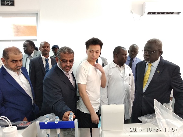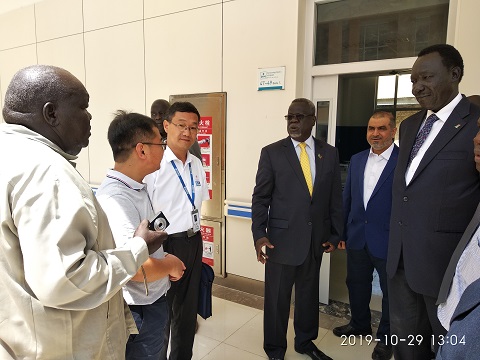 南蘇丹衛(wèi)生部部長庫克及醫(yī)療專家在門急診樓檢驗科聽取檢驗設備功能介紹