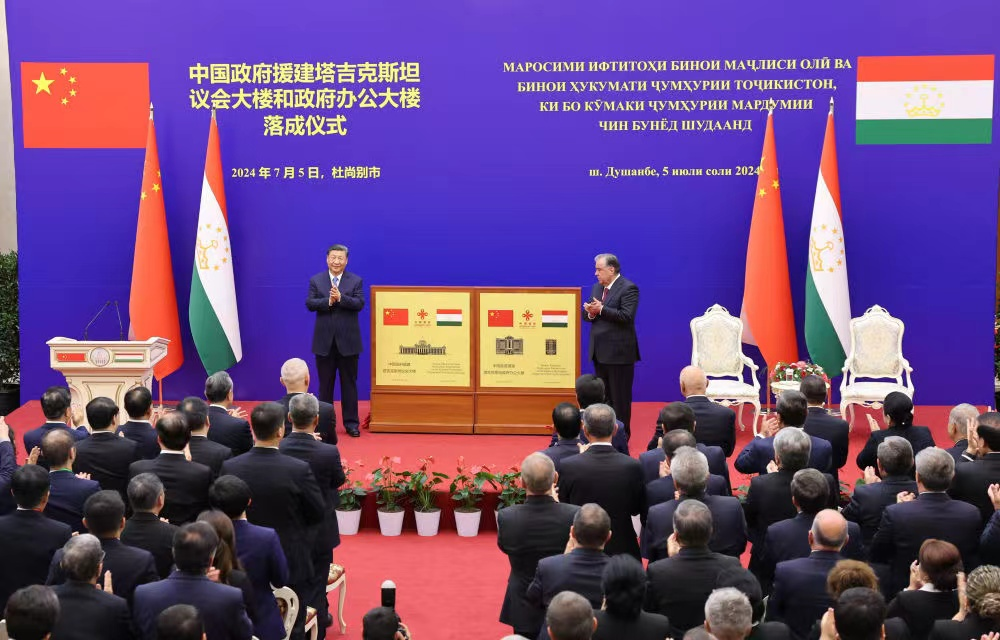 塔吉克斯坦共和國當?shù)貢r間7月5日下午,國家主席習(xí)近平同塔吉克斯坦總統(tǒng)拉赫蒙在杜尚別共同出席中方援塔議會大樓和政府大樓落成儀式。兩國元首共同參觀中方援塔議會大樓和政府大樓項目展板,共同為兩座大樓揭牌。