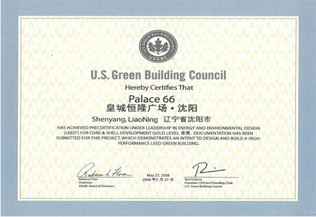 皇城恒隆廣場(chǎng)·沈陽(yáng)獲得的"能源及環(huán)境設(shè)計(jì)先鋒獎(jiǎng)─核心及外殼組別"金獎(jiǎng)的認(rèn)證證書(shū)