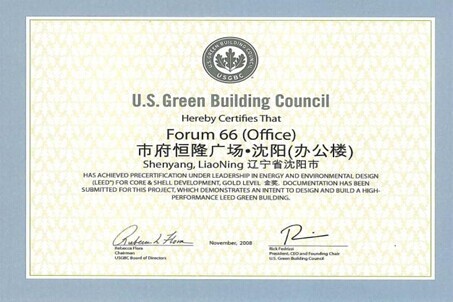 市府恒隆廣場(chǎng)·沈陽(yáng)(辦公樓)獲得的"能源及環(huán)境設(shè)計(jì)先鋒獎(jiǎng) ─ 核心及外殼組別"金獎(jiǎng)的認(rèn)證證書(shū)