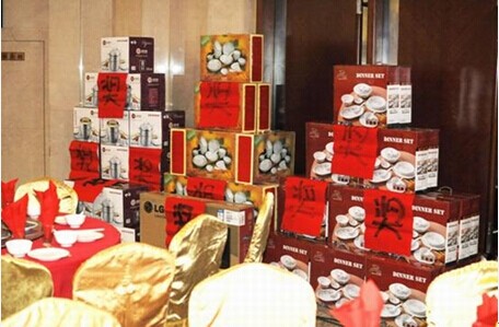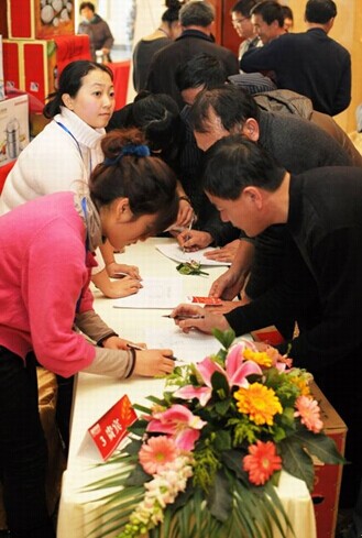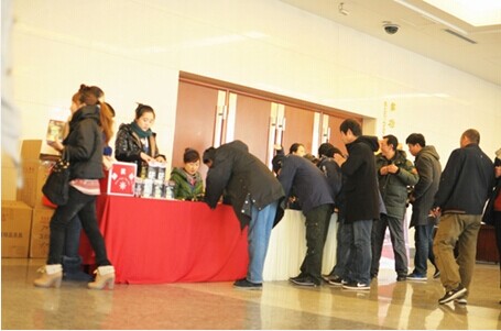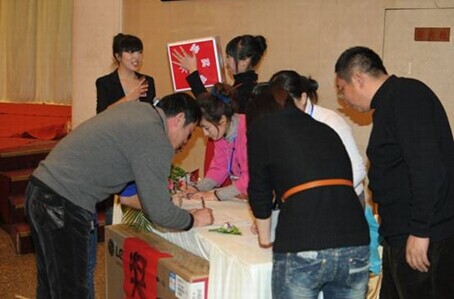簽到臺前與會(huì)員工領(lǐng)取紀(jì)念品及抽獎(jiǎng)號碼