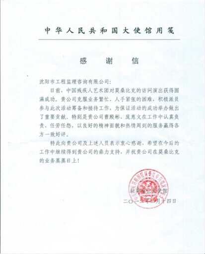 本次殘藝團(tuán)演出圓滿成功。大使首先為我司克服業(yè)務(wù)繁忙等原因積極派員參與此次活動(dòng)籌備和接待工作表示感謝,后又親切問候我司在莫業(yè)務(wù)進(jìn)展情況,并愿協(xié)助我司于莫再創(chuàng)佳績(jī)。殘藝團(tuán)團(tuán)長(zhǎng)對(duì)我司志愿者的熱情周到服務(wù)表示非常感謝;我司為能參與此次活動(dòng)提供的微薄之力感到無比榮耀,更為榮幸的是我司員工與殘藝團(tuán)演員同臺(tái)演唱慶祝此次殘藝團(tuán)演出圓滿成功。活動(dòng)結(jié)束后,我司收到一封來自中國駐莫大使館的感謝信,信中感謝我司對(duì)此次活動(dòng)的鼎力支持,并祝我司在莫業(yè)務(wù)蒸蒸日上!
