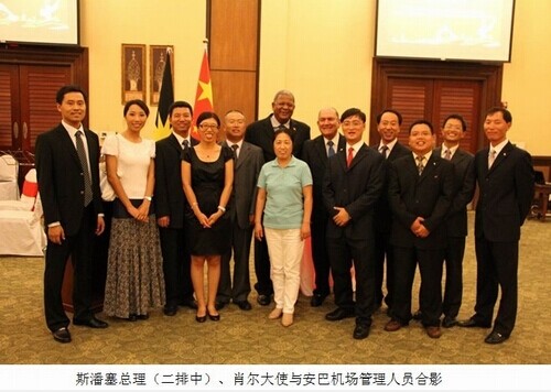 2012年9月3日晚19:00時(shí),中國駐安巴使館舉行國慶招待會(huì)慶祝中華人民共和國成立63周年。安巴總理斯潘塞閣下、安巴非常駐中國大使肖爾閣下、中國駐安巴劉漢民大使、經(jīng)商處黃躍國一秘、中國軍樂團(tuán)、安巴機(jī)場管理局代表及安巴各政要官員出席了招待會(huì)現(xiàn)場,中資企業(yè)代表、安巴項(xiàng)目管理組閆明、洪景蘭、施工單位技術(shù)組長麻宗要等主要管理人員也應(yīng)邀出席。