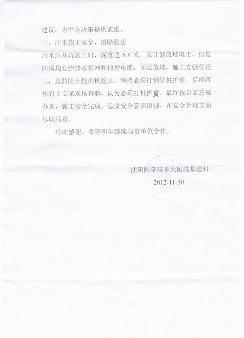 由我司馬福文總監(jiān)帶領(lǐng)的沈陽監(jiān)理團(tuán)隊(duì)監(jiān)理的沈陽醫(yī)學(xué)院奉天醫(yī)院項(xiàng)目監(jiān)理工作受到業(yè)主的表彰。沈陽醫(yī)學(xué)院奉天醫(yī)院基建辦公室發(fā)來表揚(yáng)信,感謝我沈陽監(jiān)理奉天醫(yī)院監(jiān)理團(tuán)隊(duì)積極配合甲方工作,憑借專業(yè)的監(jiān)理工作經(jīng)驗(yàn),嚴(yán)謹(jǐn)?shù)墓ぷ鲬B(tài)度,強(qiáng)烈的安全意識(shí),兢兢業(yè)業(yè)的職業(yè)精神,從合理擬定施工方案,至施工安全、質(zhì)量、進(jìn)度管理各個(gè)環(huán)節(jié),實(shí)行嚴(yán)格科學(xué)的控制和管理,保證了工程進(jìn)度和質(zhì)量的同時(shí),為業(yè)主節(jié)約投資94萬元。
