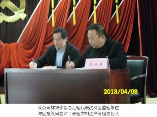 與會的市區(qū)領(lǐng)導(dǎo)總結(jié)了2012年度建筑工程安全生產(chǎn)及文明施工管理、行業(yè)工作情況,確定了2013年的工作目標(biāo)及具體實施方案。會上,沈河區(qū)建設(shè)局李冶副局長代表沈河區(qū)建設(shè)局分別與建設(shè)單位、施工單位、監(jiān)理單位和駐區(qū)企業(yè)代表簽訂了2013年安全生產(chǎn)與文明施工管理目標(biāo)責(zé)任狀。