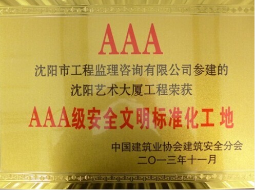 中國建筑業(yè)協(xié)會建筑安全分會根據(jù)中建協(xié)印發(fā)的《建設(shè)工程項(xiàng)目施工工地安全文明標(biāo)準(zhǔn)化誠信評價(jià)試行辦法》的規(guī)定,經(jīng)組織復(fù)查、專家評價(jià)、全體會長會研究和網(wǎng)上公示,我司監(jiān)理的沈陽藝術(shù)大廈工地被授予“AAA級安全文明標(biāo)準(zhǔn)化工地”榮譽(yù)稱號。