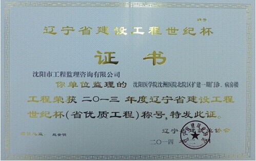 我司監(jiān)理的沈陽醫(yī)學院沈洲醫(yī)院北院區(qū)擴建一期門診、病房樓工程榮膺《二O 一三年度遼寧省建設工程世紀杯(省優(yōu)質(zhì)工程)》榮譽稱號。遼寧省建設工程世紀杯是省建設工程質(zhì)量最高榮譽獎項,由遼寧省建筑業(yè)協(xié)會每年評選一次,我公司沈陽醫(yī)學院沈洲醫(yī)院項目監(jiān)理團隊在創(chuàng)優(yōu)活動中,將保證安全文明生產(chǎn),創(chuàng)新質(zhì)量、進度、投資控制管理模式、創(chuàng)優(yōu)工程質(zhì)量為宗旨,創(chuàng)造了省優(yōu)質(zhì)工程管理佳績,為公司贏得了榮譽,為業(yè)主呈交了一份滿意的答卷。
