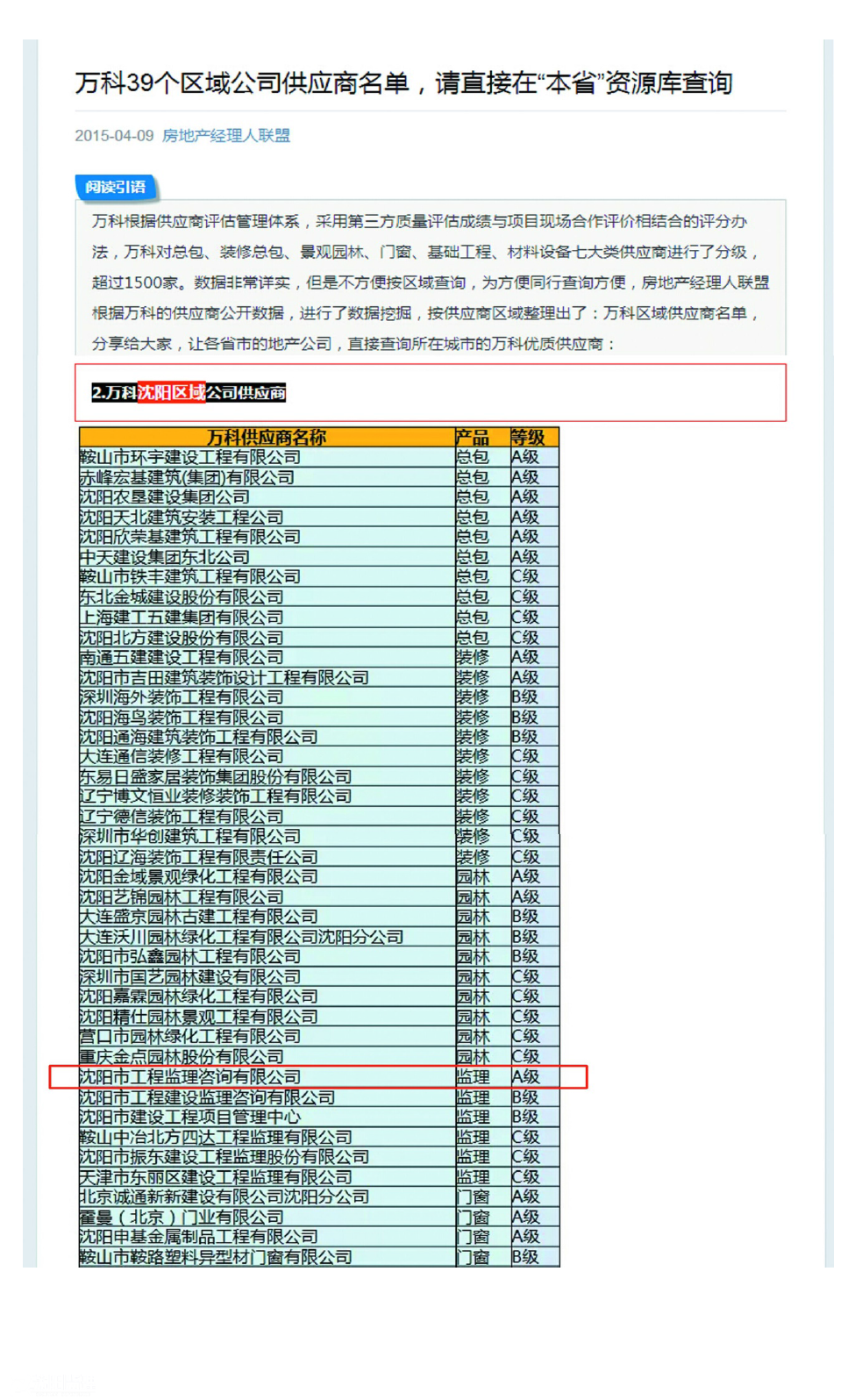 萬科根據(jù)供應(yīng)商評估管理體系,采用第三方質(zhì)量評估成績與項目現(xiàn)場合作評價相結(jié)合的評分辦法,對萬科39個區(qū)域總包、裝修、監(jiān)理、景觀園林、門窗、基礎(chǔ)工程、材料設(shè)備七大類1500余家供應(yīng)商進行了分級。我公司在萬科沈陽區(qū)域入選的六家監(jiān)理單位供應(yīng)商名單中被評定為唯一一家A級監(jiān)理供應(yīng)商。