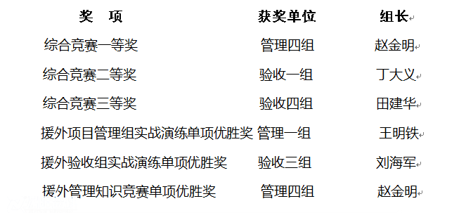 各組在各項競賽環(huán)節(jié)中充分展現(xiàn)了援外管理者在援外項目管理和援外驗收工作中,對流程的掌控能力,對重點難點問題的解決能力,對安全質(zhì)量問題的排查能力,對團隊建設的凝聚力等綜合管理素質(zhì),并對公司援外管理和驗收工作提出合理化建議。