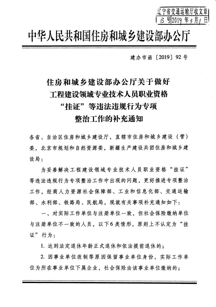 住房和城鄉(xiāng)建設(shè)部辦公廳關(guān)于做好工程建設(shè)領(lǐng)域?qū)I(yè)技術(shù)人員職業(yè)資格“掛證”等違法違規(guī)行為專項(xiàng)整治工作的補(bǔ)充通知