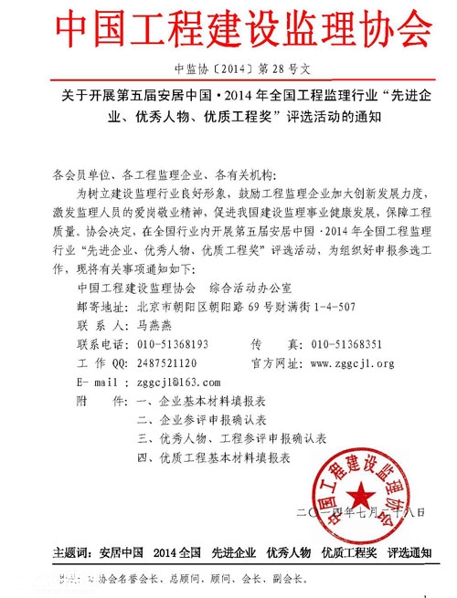 關(guān)于開展第五屆安居中國(guó)·2014年全國(guó)工程監(jiān)理行業(yè)“先進(jìn)企業(yè)、優(yōu)秀人物、優(yōu)質(zhì)工程獎(jiǎng)”評(píng)選活動(dòng)的通知