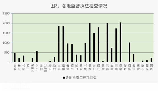 各地共下發(fā)監(jiān)督執(zhí)法檢查整改單9589份、行政處罰書(shū)892份,處罰相關(guān)單位330個(gè),處罰相關(guān)人員135名,實(shí)施信用懲戒250起,曝光違法違規(guī)典型案例142起。從行政處罰起數(shù)看,安徽、湖南、山東3個(gè)省處罰力度較大;從曝光典型案例起數(shù)看,云南、重慶、海南3個(gè)省、直轄市曝光力度較大。