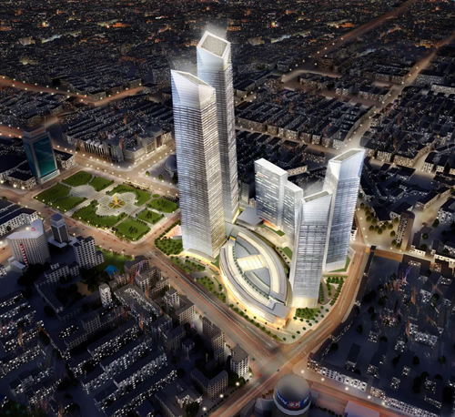 由香港恒隆房地產(chǎn)有限公司開發(fā)的現(xiàn)今沈陽最大的港方獨資商業(yè)地產(chǎn)項目——沈陽恒隆市府廣場。規(guī)劃建設(shè)世界級購物中心、辦公樓群、5A級高檔寫字間,美國 LEED認證白金六星級酒店及服務(wù)式寓所,建筑面積約達150萬平方米,其中雙塔樓高度分別為350.8米、400米。